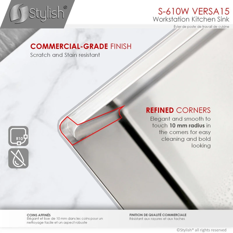 All welds and corners are perfectly blended through an automated machine buffing system and carefully hand polished for a luxurious finish. This undermount single bowl kitchen sink workstation has elegant and smooth to touch 10mm radius in the corners for a bold look and at the same time add functionality allowing to clean the kitchen sink very easily.