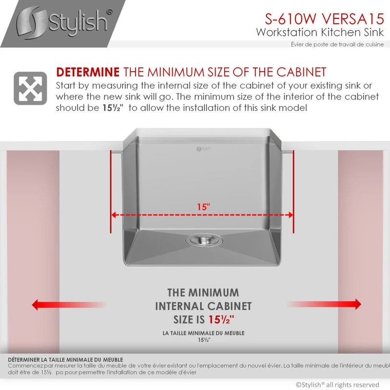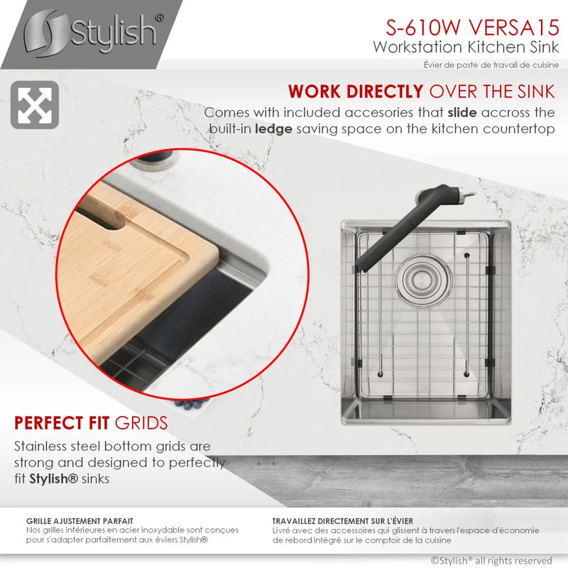 Adding style and functionality to your kitchen has never been easier with the amazing Versa15 kitchen sink workstation which includes one 15”x19” single bowl undermount stainless steel kitchen sink, one protective stainless steel bottom grid, one perfect fit bamboo cutting board. This workstation sink comes with the ledge on the longer sides of the sink. This ledge allows the kitchen sink accessories to perfectly fit making it a unique and functional experience. The undermount stainless steel kitchen sink features a rear set drain that truly allows maximum space under the kitchen cabinet. The Sink bottom is designed with small slope and grooves for efficient water drainage. Another great reason to have this workstation installed is the undermount soundproofing, sink is covered with thick pads on all sides, it is guaranteed to be silent while in use, additionally there is an undermount coating that will protect your kitchen cabinet from condensation. Made from premium material, the Versa15 workstation is handcrafted using super thick 16 gage and premium 304 stainless steel with 18/10 chrome/nickel content and featuring a commercial-grade satin finish to hide marks and scratches and unlike most competitors this sink features gently rounded corners all around to make cleaning as simple as wiping the surface with a damp cloth. This workstation would not be completed without our luxury basket strainer. Also included, the basket strainer is larger and more efficient than regular strainers as it catches food scraps and debris to prevent the drain from getting clogged. For easy installation, all mounting hardware and installation instructions are provided. Our stylish and functional single bowl undermount kitchen sink workstation is what your kitchen is missing.