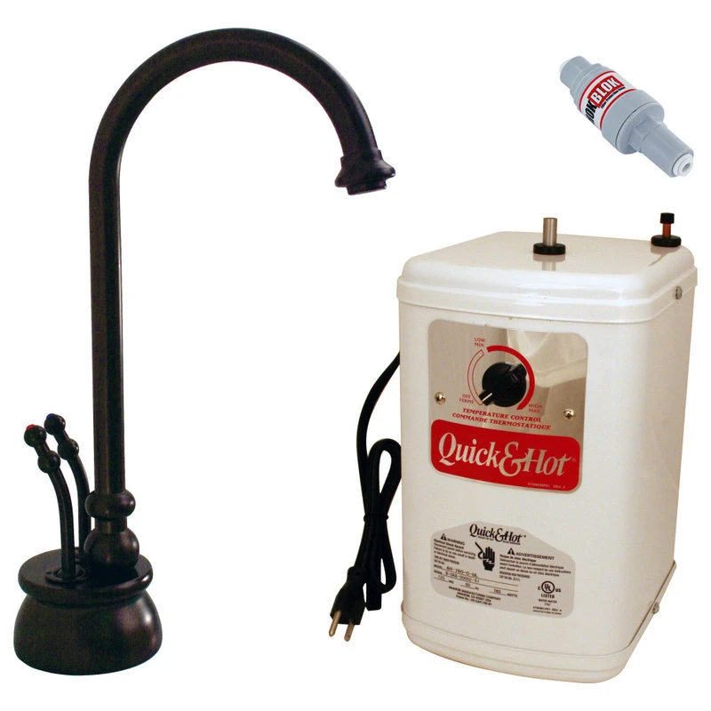 “Two handle hot/cold water dispenser (D262-NL-) and Tank (QHT-1), with ShokBlock valve, Traditional styling, Auto-off handle function, Santoprene hot water tub, 1/4”. 3/8″ compression supply lines, 5/8″ gallon tank with 60 cups/hour delivery, includes carbon block filter, (F400) mounting bracket and Two Pack D214 Basket and D2089SEV Disposer, Large Post nut style kitchen sink basket and strainer