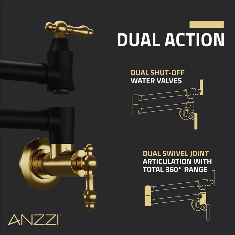 The ANZZI Marca Series wall mounted pot fillers perfectly blend today’s traditional design and reliability with classical elegance and grace. The featured dual pivot joint allows for maximum reach and positional flexibility ensuring the 4 gpm spout is always positioned exactly where you need it to be. The strategic double water valve system also for initial water flow activation at the base along with convenient water flow control on the spout itself. Built using RHINO ALLOY certified steel and brass the Marca Series pot filler delivers reliable durability, convenient articulation and long-lasting performance.