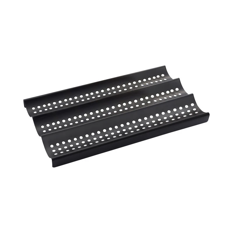 The ZenUrban 870002 nonstick 3-loaf perforated baguette French bread pan forms those delightful long slender loaves of bread that we all love. The holes in this pan allow complete air circulation around the bread loaves. Made of commercial-grade carbon steel for even heat retention, and coated with a dishwasher nonstick surface for easy cleaning. The pan measures 16 x 9 x 1-inch (41 x 23 x 3 cm) and has three troughs so you make three loaves in one pan. The pan can easily be placed on the shelf of your oven or directly on a baking stone to get the benefits of stone baking. These pans are designed to hold 1 1/2-pounds of bread dough. Non-metal utensils should be used to prevent damage to the finish.