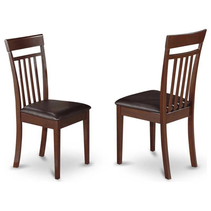 East West Furniture MZCA3-MAH-LC 3Pc Dining Table Set Consists of a Modern Dining Table and 2 Modern Dining Chairs with Faux Leather Seat, Drop Leaf Table with Slat Back Chairs, Mahogany FinishRenovate your kitchen room with this particular simple yet useful MZCA3-MAH-LC wood dining table set. Crafted in the transitional style for your kitchen place, the dining set will be a welcome area for your friends and family to gather during meals and social activities. The comfortable 3 pieces kitchen set contains a small kitchen table and two dining chairs. Manufactured from Asian tropical hardwood commonly called rubberwood, the small kitchen table finished in Mahogany has smooth edges and fashioned round legs for a fancy style. The rectangular table features two 9-inch drop down leaves that provides additional space for extra food trays and drinks. The 2 drawers of the dining table provide additional storage to help keep you organized. The easy to assemble rectangular table ensures pleasure and long-lasting use. These kitchen chairs present fashionable and comfy seating, with faux leather seats to match preference and ideal motif. Made up of hardwood, the kitchen chair is stable and offers a sturdy finish. The wood dining chair features turned legs and a curved slatted back. The frame of the dining room chairs is engineered to offer a great amount of comfort to your spine and thus reduce the chances of back pain. The durable faux leather seat does not retain moisture, will last a long time and can usually be wiped clean with a rag and warm water easily. The matching color of the dining chair set with the small table brings a good contrast in the dining area. This contemporary, affordable, durable and comfortable kitchen and dining room tables can be a good choice if you are looking for a great dining time experience with your family or friends. Table Specifications: Material: Asian Hardwood Color: Mahogany Dimensions: Length 36 extendable to 54; Width 36; Height 30 Chair Specifications: Frame Material: Asian Hardwood Upholstered: Faux Leather Cushion Material: Foam Color: Mahogany Dimensions: Length 20; Width 17; Height 38 Weight Capacity: 300 lbs Fabric Color: Includes: 1 x Rectangular Table 2 x Faux Leather Chair N.B.: Hardware package and instruction manual is located in/under the seat.
