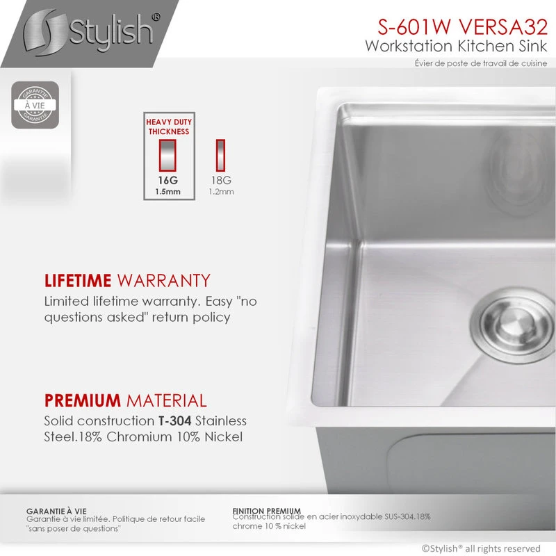 Stylish handmade stainless steel sinks combine functionality, quality and affordability. Made of surgical-grade SUS 304 stainless steel in 16 Gauge, with an optimized 18pct Chromium and 10pct Nickel content to provide excellent strength and hardness. The specially chosen satin finish will hide water spots and maintain a uniform patina finish as the sink ages. The extra-deep basin accommodates pots and pans easily and hides dirty dishes in the sink basin and under the countertop line. The tight-10mm radius corners are perfectly blended through an automated machine buffing system and careful hand-polished, for a luxurious finish. This sink comes with two bottom grids, bamboo cutting board, colander and a roll-up drying rack.