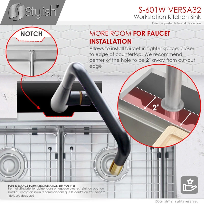 All Stylish sinks are equipped with a soundproofing system including a protective coating and extra-thick rubber pads to create a noticeable lower tone and overall a very quiet sink. This coat is sprayed underneath the sink to prevent water condensation. For added functionality, Stylish® VERSA workstation kitchen sinks come with luxury basket drain strainers, which are deeper and much more functional for catching food scraps than the regular strainers. Stylish® sinks are Canadian designed and meet the highest plumbing standards for North America. The sinks have drains towards the rear, for better utilization of the space under the sink cabinet. Also, sink basins have drain grooves for optimal drainage.
