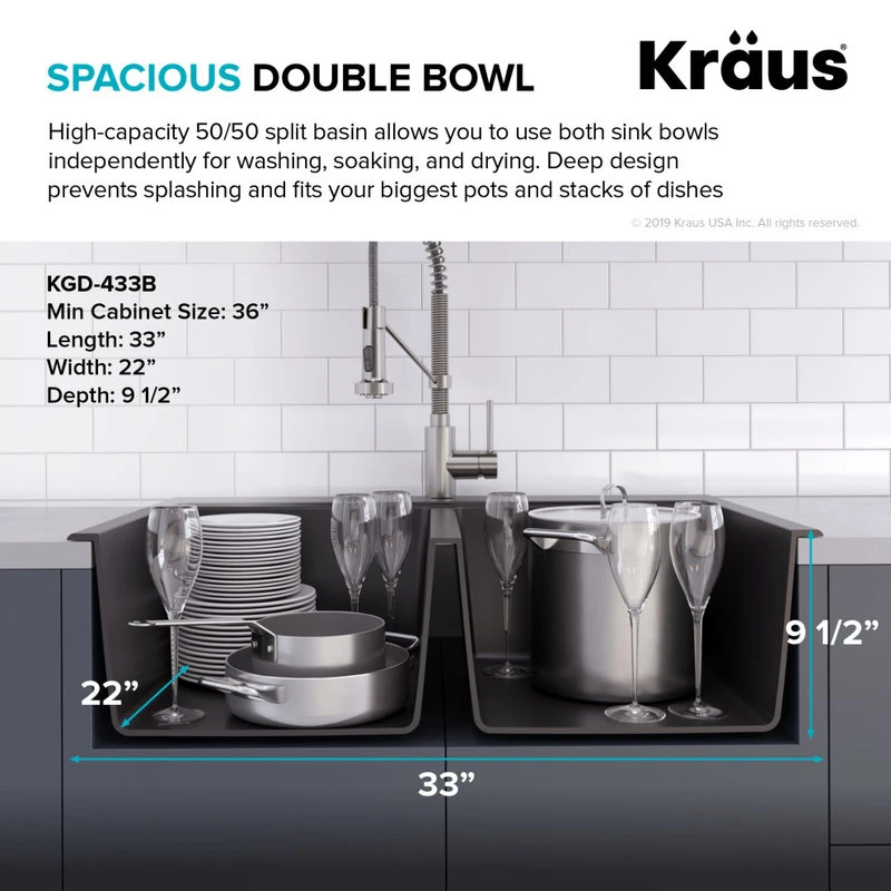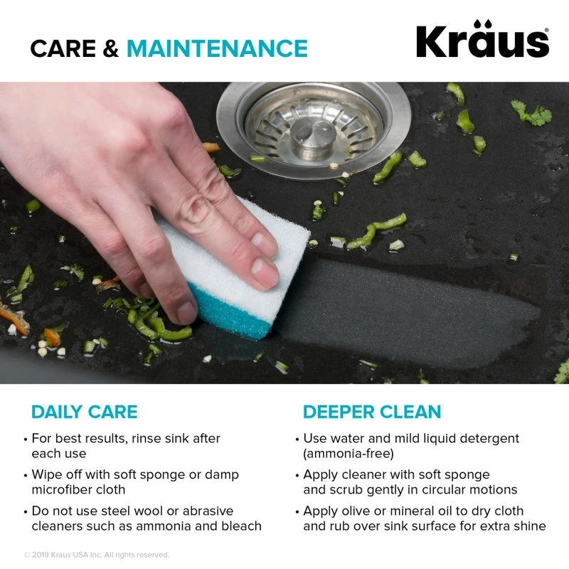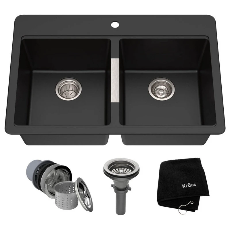 Kraus dual mount granite sinks create an instant style upgrade for the kitchen. Constructed from 80% natural granite, with the look and feel of real stone, these modern kitchen sinks look striking in a variety of settings. Clean lines and thoughtful design details highlight the organic elegance of granite, for an eye-catching look with contemporary appeal. The extra-deep basins accommodate large dishes with ease, while the gently rounded corners make sink maintenance simple. Each non-porous sink is protected with a thermal finishing process, creating a surface that is highly resistant to heat, chemicals, scratching, chipping, and discoloration. This double bowl sink provides a lifetime of functionality with versatile style. The 50/50 split basin adds flexibility for a variety of kitchen tasks. The basin is self rimming, creating a finished look for your kitchen. Choose from easy topmount installation, or install the sink as an undermount for a seamless look. For added convenience, a basket strainer drain assembly and complimentary towel are included free with purchase. Constructed from premium stainless steel, the top-quality basket strainer assembly creates a tight seal to prevent food and debris from clogging the drainpipe. For easy installation, all mounting hardware is provided. Experience Kraus Quality and bring your best kitchen ideas to life.