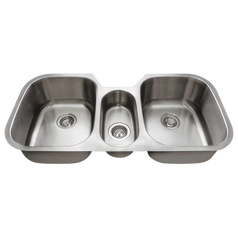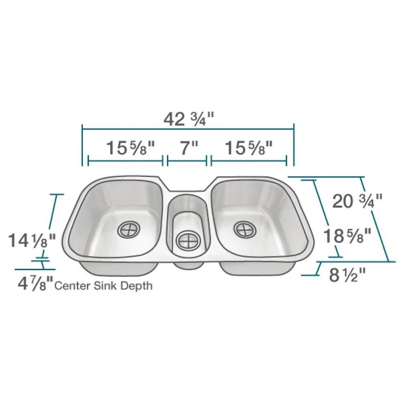 An extremely busy kitchen requires an extremely functional sink. This undermount model features two equal-sized bowls of reasonable depth straddling a smaller, shallower prep basin. The center sink is aligned with the front of the other bowls, creating a void along the back for installation of the faucet. This model is 304-grade, cold rolled steel, at a 16-gauge thickness; 25% thicker than the industry standard 18-gauge. The surface is given a brushed-satin finish which adds to its luster and masks minor scratches which could occur over time. Dense, sound-dampening pads and an insulation coating are applied to the underside. With an overall measurement of 42 3/4″ x 20 3/4″ x 8 1/2″, it will require a minimum-width cabinet of 45″. It is cUPC certified. This listing does not include any accessories.