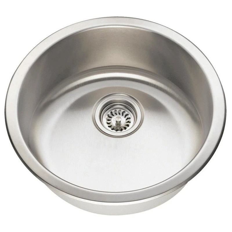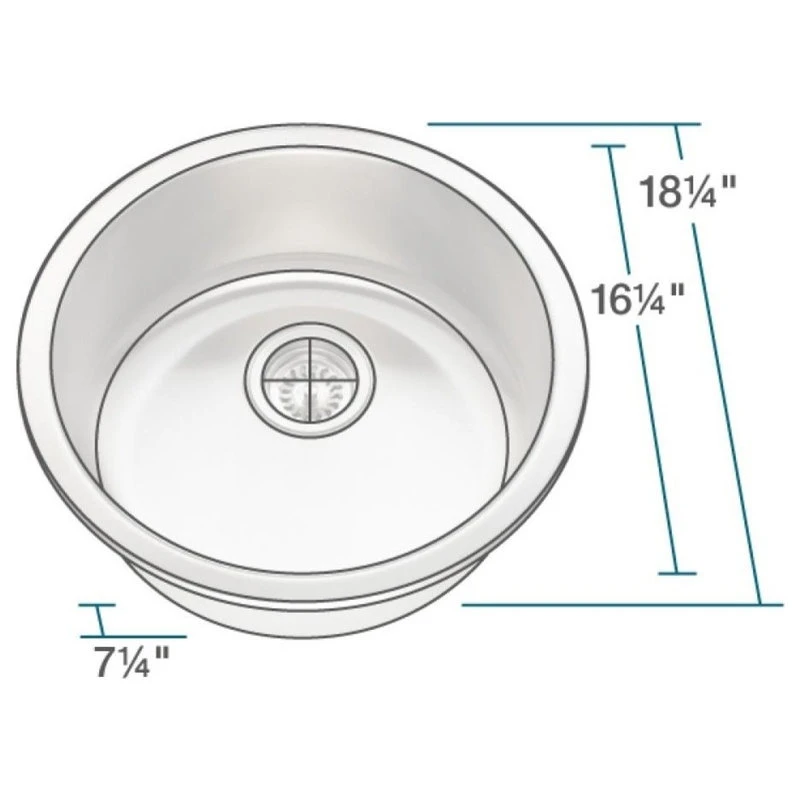 This round, bar sink can be top or undermounted; and its durability and size makes it practical in locations beyond the entertainment area. In the kitchen, it acts as the ideal prep sink; or even the primary sink if space is limited. And if stainless steel fits the decor, it is a great option for the bath. This model is 304-grade, cold rolled steel, at a 16-gauge thickness; 25% thicker than the industry standard 18-gauge. The surface is given a brushed-satin finish which adds to its luster and masks minor scratches which could occur over time. Dense, sound-dampening pads and an insulation coating are applied to its underside. With an overall measurement of 18 1/4″ x 18 1/4″ x 7 1/4″, it will require a minimum-width cabinet of 21″. It is cUPC certified. This listing does not include any accessories.
