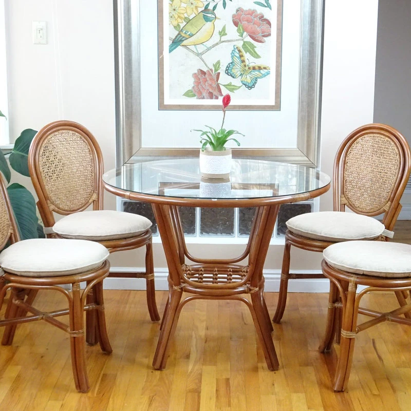 Denver 5-piece dining set creates a comfort atmosphere for everything from simple home breakfast to big gatherings. This cozy and casual dining set combines graceful legs and vintage chair backs with a round lovely tabletop and seating. Create a warm, comfortable breakfast nook or enclosed patio dining area with this incredible furniture! Set includes dining table and 4 side chairs. Why is it so unique? Firstly, all products of this set are made from natural rattan, class A ECO-friendly material, which comes to us from Indonesia. Secondly, this furniture will bring both comfort and style to your place. A wonderfully sized seat and a pleasant traditional style make Denver one of our best selling products. The quality and beauty of our rattan products began from our passion and attention to details. That’s why it is an excellent decor addition to any place of your home. If you want to make your space cozy and beautiful our family owned company is here for you. All our products are made from the natural materials. That`s why color of any rattan item may look slightly different (brighter/lighter/darker). It also depends on the settings of your monitor. If you have any doubts, please contact us to confirm the color.