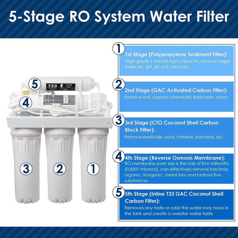 - 5-Stage Reverse Osmosis System – 100 GPD Drinking Water Filter utilizes 5 Stage RO process for effectively purifying your water by removing unhealthy material or impurities, bringing benefit to your health & improving your life quality