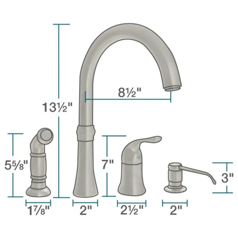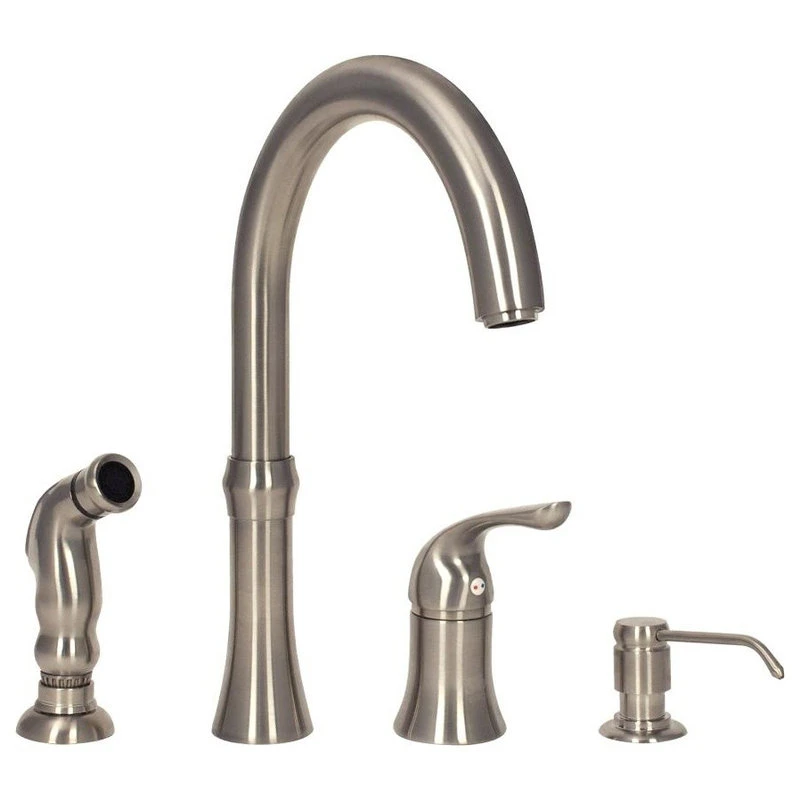 The 710-BN Four-Hole Kitchen Faucet is available in a brushed nickel, oil-rubbed bronze, or chrome finish. It contains a 360 degree spout and includes a soap dispenser and side spray for easy cleaning. The dimensions for the 710-BN are 12 5/8″ tall with a 9 7/8″ spout reach and it is ADA approved. The faucet is pressure tested to ensure proper working conditions and is covered under a lifetime warranty. The 710-BN has so many great components that are sure to make your kitchen sink user-friendly.
