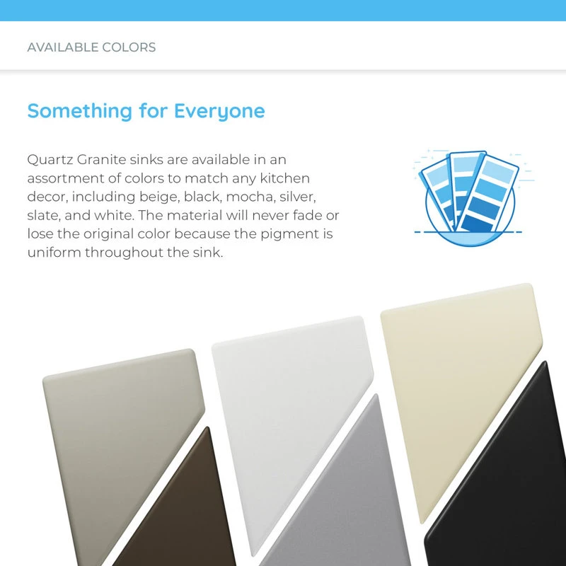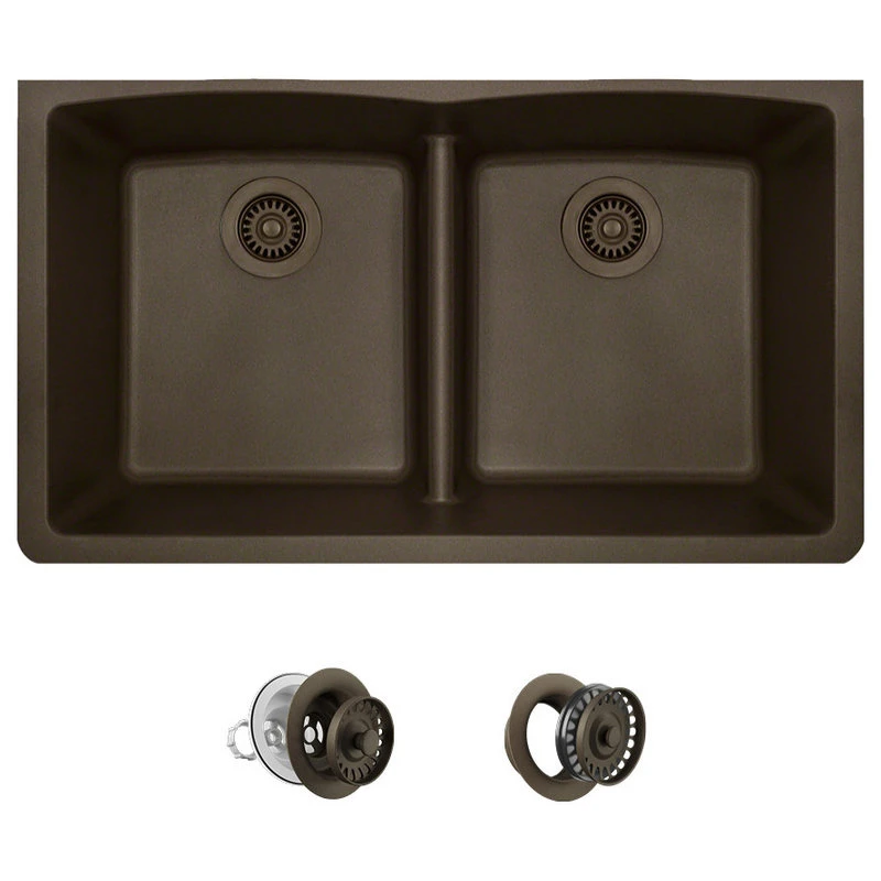 The MR Direct 812-Mocha Quartz Granite sink is made from a material comprised of 80% Quartz and 20% Acrylic. The 812-Mocha is stain and scratch-resistant and can resist heat up to 550. Its low divide and deep bowls provide more functionality, especially with large pots and pans. The smooth non-porous surface is easy to clean, leaving nowhere for bacteria to thrive. The overall dimensions of the sink are 36″ x 19″ x 10 3/4″ and a 36″ minimum cabinet size is required. The sink contains 3 1/2″ offset drains and is available in multiple colors. As always, our Quartz Granite sinks are covered under a limited lifetime warranty for as long as you own the sink. One matching strainer, for catching unwanted waste, and one matching flange, for use with a garbage disposal, is included in this kit.