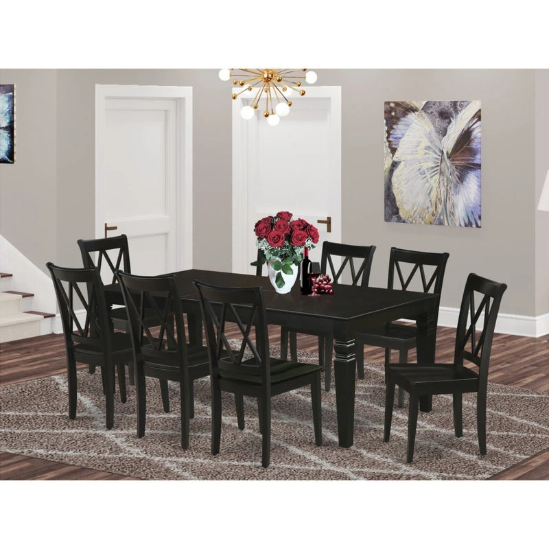 LGCL9-BLK-W 9Pc Rectangle 66/84″ Dining Table With 18 In Leaf And 8 Wood Seat Dining ChairsTreat your room’s decor with a new and polished look with this modern LGCL9-BLK-W dining set. This type of rectangular kitchen table facilitates an affectionate family feeling. A comfortable and elegant Black color offers any dining area a relaxing and friendly feel with the kitchen table. This well-designed and comfortable kitchen table may be used for hours at a time. This rectangular dining table is best for 4-8 people to sit and enjoy their meal. This wonderful dinette table makes a really good addition for all kitchen space and corresponds all sorts of dining-room concepts. Slender double X back kitchen chairs finished in Black color with wood seats present fashionable and cozy seating. Made up of hardwood, the wooden chair is stable and offers a sturdy finish. The dining chairs add elegance and class to any place you have placed them. The frame of the dinette chairs are engineered to offer a great amount of comfort to your spine and thus reduce the chances of back pain. The matching color of the chair with the table brings a good contrast in the kitchen area. The standard shape, size and design makes the dining area significantly attractive. This contemporary, budget friendly, durable and comfortable dining set can be good choice if you are looking for a great dining time experience with family and friends.