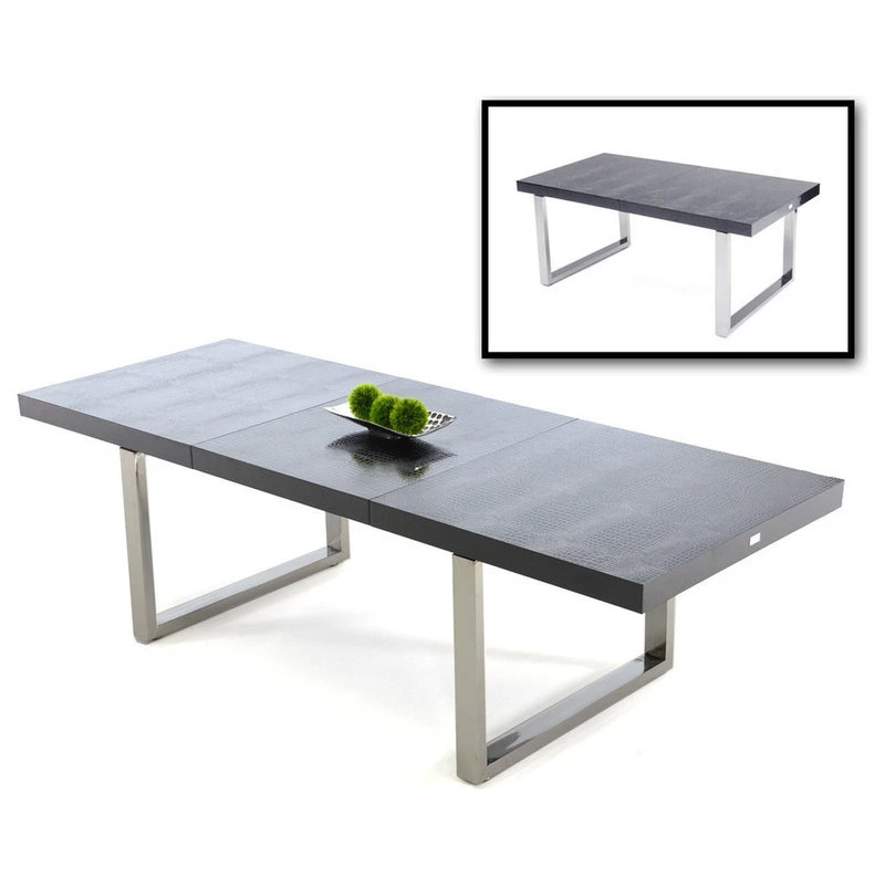 The Skyline extendable dining table features a laser-cut crocodile textured finish in black gloss lacquer. Square stainless steel legs complement the sleek lacquer finish. Matches the A&X Casa Luxury Collection and available in black or white with the option of crocodile texture. W71″/100″ x D37″ x H30″