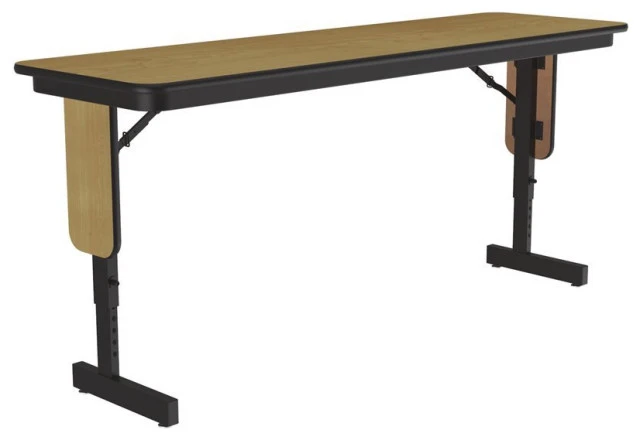 Panel Leg Adjustable Height Folding Seminar Table. Folding mechanism attached to back leaving underneath table open for user’s leg room. Side Panels give table a finished, dressy look. Made in USA.