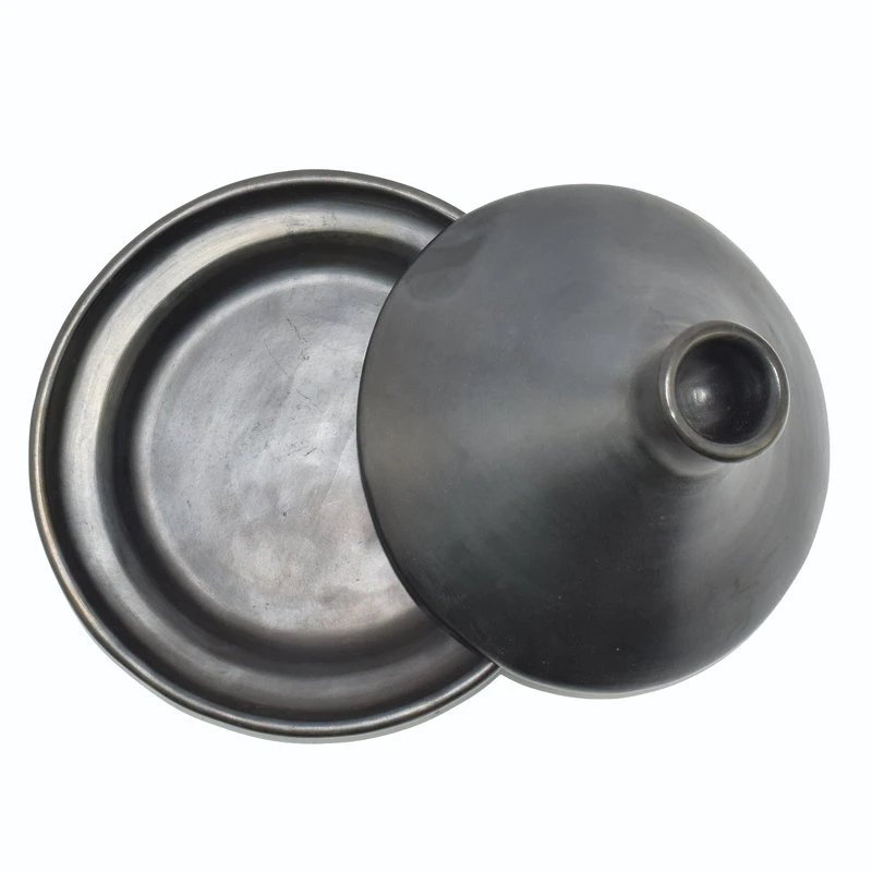 Originally from North Africa, a Tagine is the name of a dish as well as the conical pot in which it is cooked. Our version of the pot comes from La Chamba and it is a beautiful Black Clay Version. Length 12 in x Width 12in, Height 7.0in (to the top of the cone), Diameter 12in, Capacity 24 oz. The Tagine can be used on a stovetop, both gas or electric, an open fire as traditionally used, and it can be placed in the oven. Completely natural and safe, contains no toxins or lead and the porous nature of the clay allows the slow evaporation of steam and produce food that is healthier, tastier, and moist using less fat and liquids. Will last many years with proper use and care (each piece comes with a product information sheet outlining the Uses and Care for the product). It is still made in the traditional black clay manner, by families in a small village on the banks of the Magdalena River in Central Colombia. Each piece is hand-made using local area clays, then hand burnished with a stone. The pieces are then fired in the village, giving them the distinctive black color and elegant look.