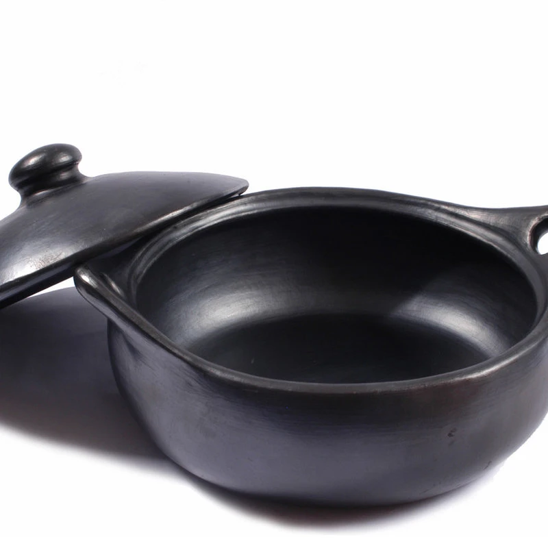 Flat casserole – stew pot in black clay from La Chamba. Length 15.8in (handles included), Width 13.5in (from outside), Height 8.5in, Diameter 12in and Capacity 6qt (filled comfortably whitout overflowing). The flat bottom shape is well suited for microwave, gas or electric ranges, and perfect for placing in an oven for slow cooking stew, casseroles or rice and seafood sush as Mariscada served with a great presentation. Completely natural and safe, contains no toxins or lead and the porous nature of the clay allows the slow evaporation of steam and produce food that is healthier, tastier, and moist using less fat and liquids. Will last many years with proper use and care (each piece comes with a product information sheet outlining the Uses and Care for the product). Black Clay, La Chamba Cookware, is well-known and used throughout Colombia in restaurants and homes for preparing and serving traditional dishes. Its origins can be traced back at least 700 years to vases and pitchers found in pre-Columbian archaeological sites. It is still made in the traditional manner, by families in a small village on the banks of the Magdalena River in Central Colombia. Each piece is hand-made using local area clays, then hand burnished with a stone. The pieces are then fired in the village, giving them the distinctive black color and elegant look.
