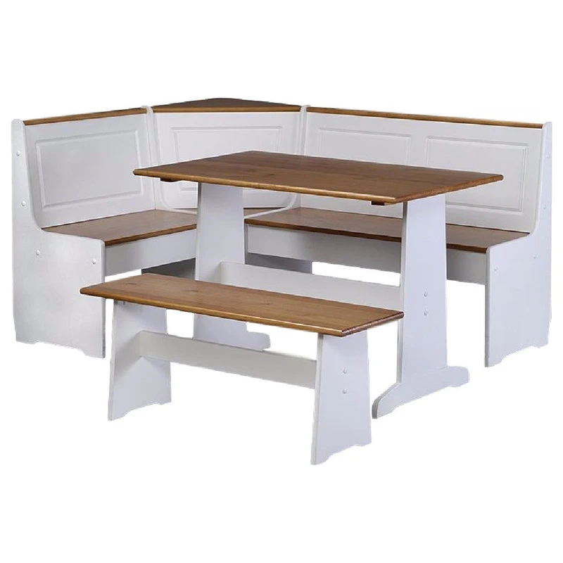 Ardmore Corner Nook Set. Nestled in a corner of your kitchen this nook set is the perfect spot for meals or family gatherings. The contrasting finishes on this corner nook give it a traditional farm house appeal. The set includes five pieces; side bench, table and long and short benches with a wedge.