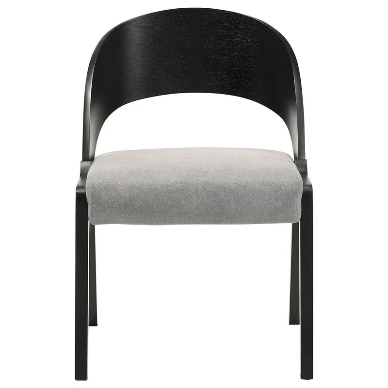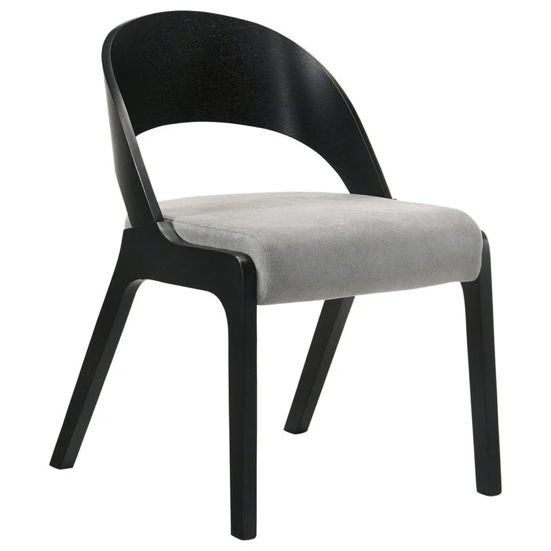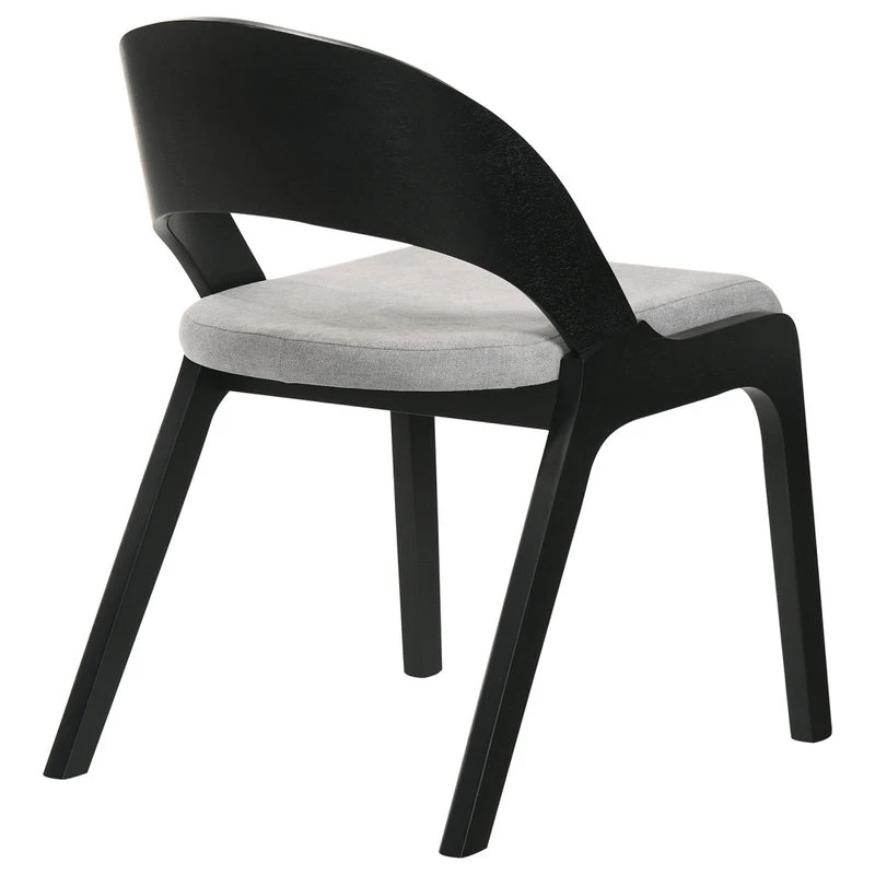 - Sleek dark table is calmed by the soothing neutral colors of the accompanying chairs