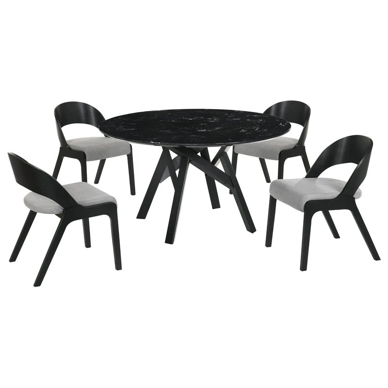- Venus Contemporary Dining Set comes with 1 Table in dark finish and marble top, and 4 Polly Black upholster Chairs