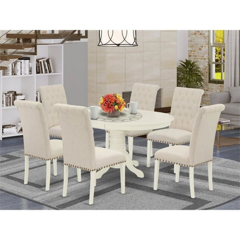 The gorgeous Atlin Designs dinette set includes a medium size dining table and six parson chairs brings an affectionate family feeling in the kitchen space. A cozy and luxurious linen white color offers any dining-room a relaxing and friendly feel with this particular kitchen table. The oval shape table features a pedestal base that will furnish your dining area with a sophisticated look. With a soft rounded bevel at the edge of the table top, this well-designed and comfortable kitchen dinette table may be used for hours at a time. Made up of rubber wood, the table is stable and offers a sturdy finish. A regal and affordable Parson chair offers a touch of beauty to any dining room and provides a sensible seating arrangements. The upholstered dining chair features a beautiful stitched exterior. Tall back, Linen Fabric, high-density foam padding, solid hardwood frame construction, comfortable, durable and attractive. Whether you use this kitchen chair is an easy to assemble and stylish answer to your seating needs. The standard shape, size and design makes the dining area significantly attractive. This contemporary, budget friendly, durable and comfortable dinette set can be good choice if you are looking for a great dining time experience with your family or friends.
