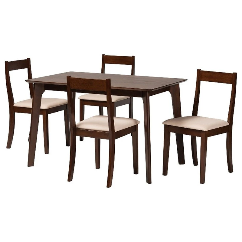 The streamlined elegance of the Carola dining set upholds an atmosphere of grace for any occasion. Made in Malaysia, this lovely set includes four chairs and one table built from sturdy wood. Each chair is fitted with a plush foam-padded cushion upholstered in soft fabric as well as a curved backrest for a cozy dining experience. The Carola requires assembly and features a broad, rectangular tabletop to ensure ample space for each member of the table. An easy yet dignified addition, the Carola dining set elevates any arrangement.