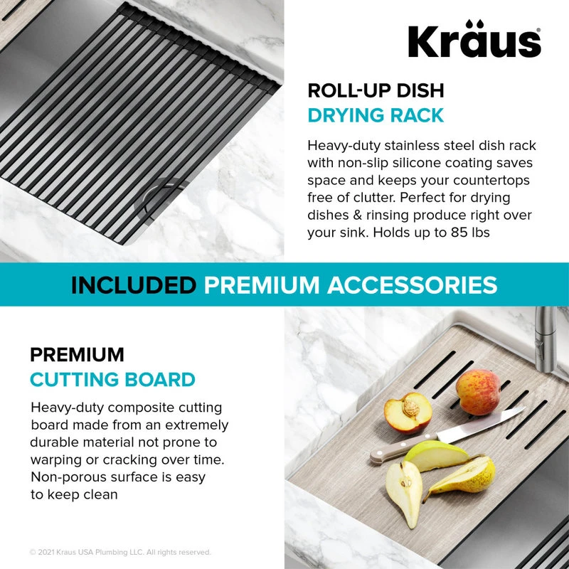 RECOMMENDED ACCESSORIES (sold separately): Keep your counters dry with a self-draining silicone drying mat (KDM-10) that drains water directly into the sink. Protect your sink with a premium stainless steel bottom grid (KBG-GR2514)