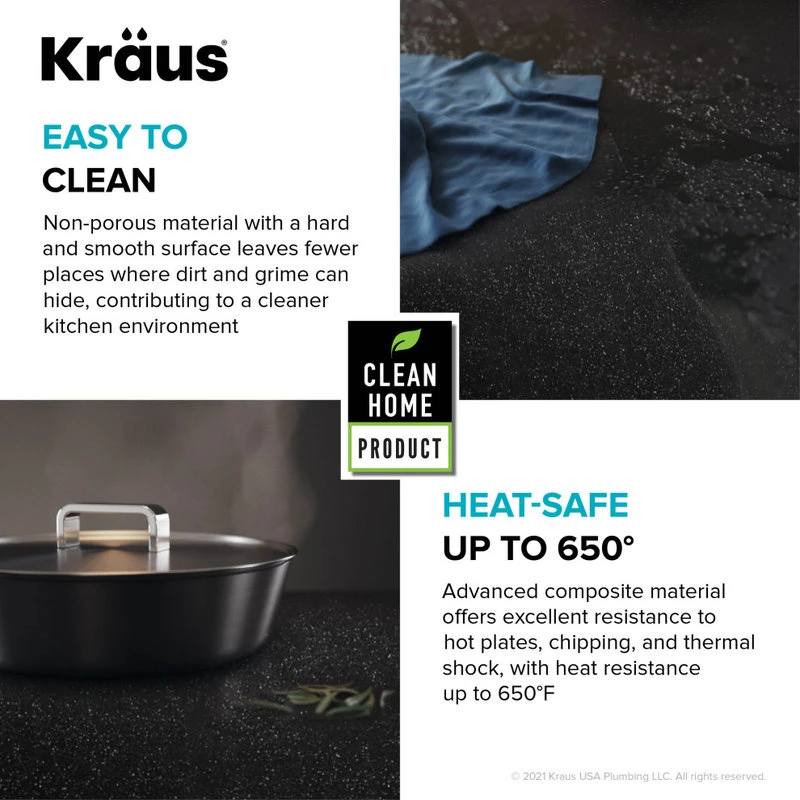 PLEASE NOTE: Although Kraus granite and quartz composite sinks are highly heat resistant, placing hot items right from the stove or oven directly into the sink may cause surface discoloration. Consider using a trivet or rolling mat for extremely hot items to avoid potential damage