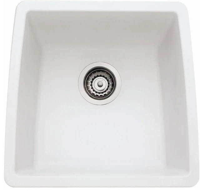 Product Features: Bar sink finished in white; Sink composed of granite composite; Installation type: Undermount; Number of faucet holes: 0; Faucet hole center-to-center: 0″; Drain placement: Rear; Number of basins: 1; This sink is warrantied and manufactured by Blanco; Overall Dimensions: Overall sink length: 17.5″; Overall sink width: 17″; Overall sink height: 9″; Basin Dimensions: Interior depth: 9″; Interior length (left to right): 15.5″; Interior width (front to back): 15″;