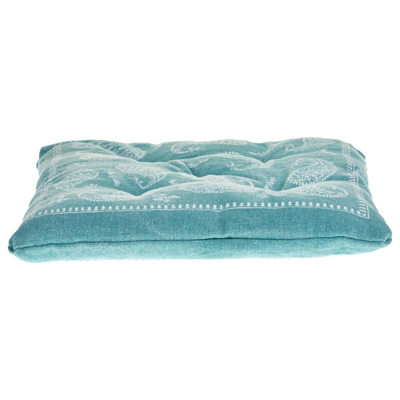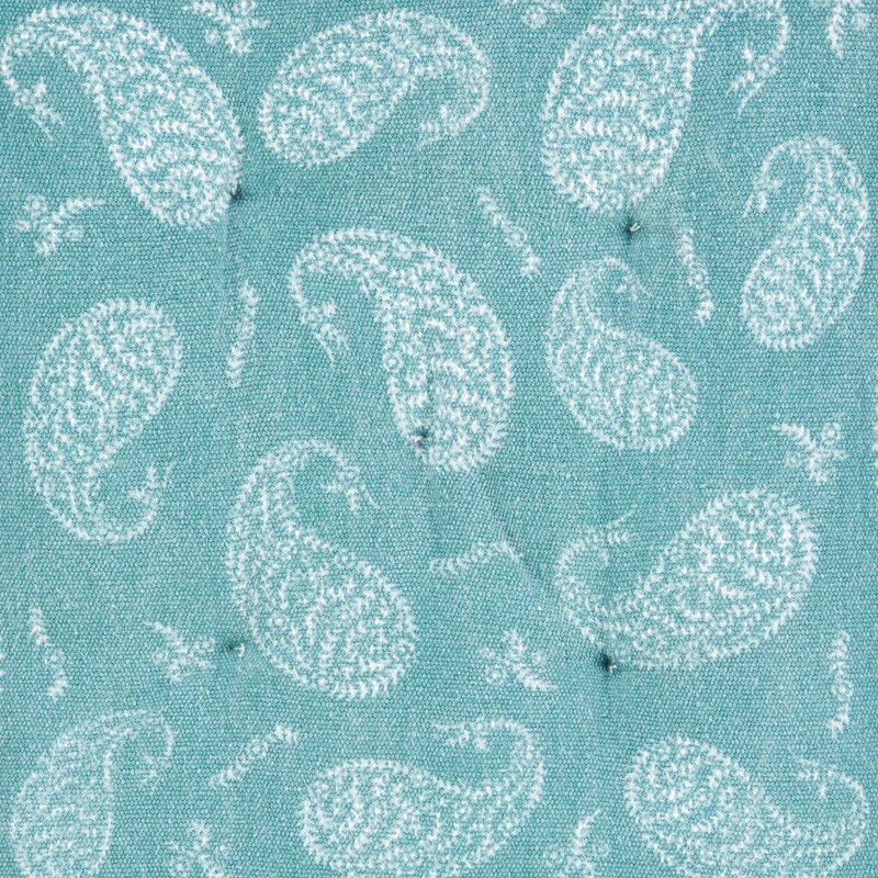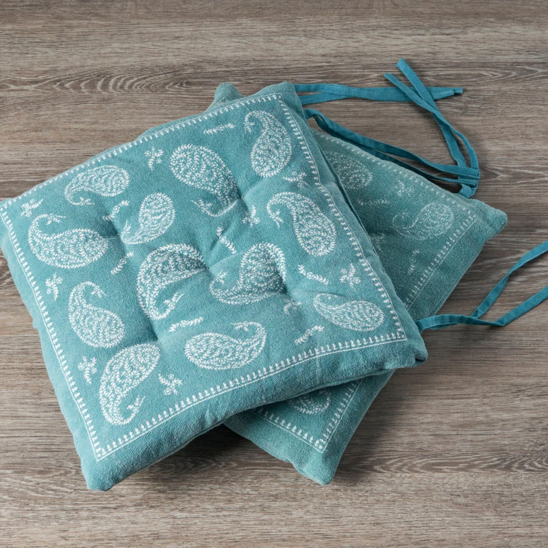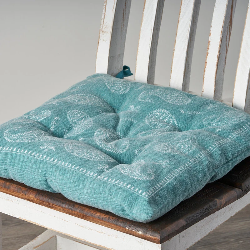 With an intricate paisley design, this chair cushion adds a lovely flair to your kitchen, dining room, or even sunroom! The bordering accent to this piece is quite eye catching! The possibilities are endless with this versatile cushion. This particular edition to the collection features a square shaped design with a thick cushion. Ribbon ties allow this item to be tied securely to a chair or simply tucked away and placed neatly in the chair for a more relaxed look. The soft fill will allow for a new, comfortable edition to your home!