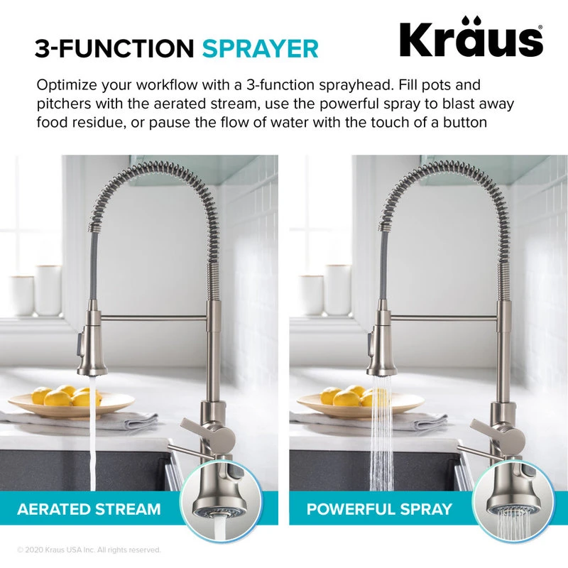 - 3-FUNCTION SPRAYHEAD with large non-slip rubber button switches between aerated stream for everyday cleaning to powerful spray for heavy-duty rinsing, pause function allows you to stop the flow of water when needed