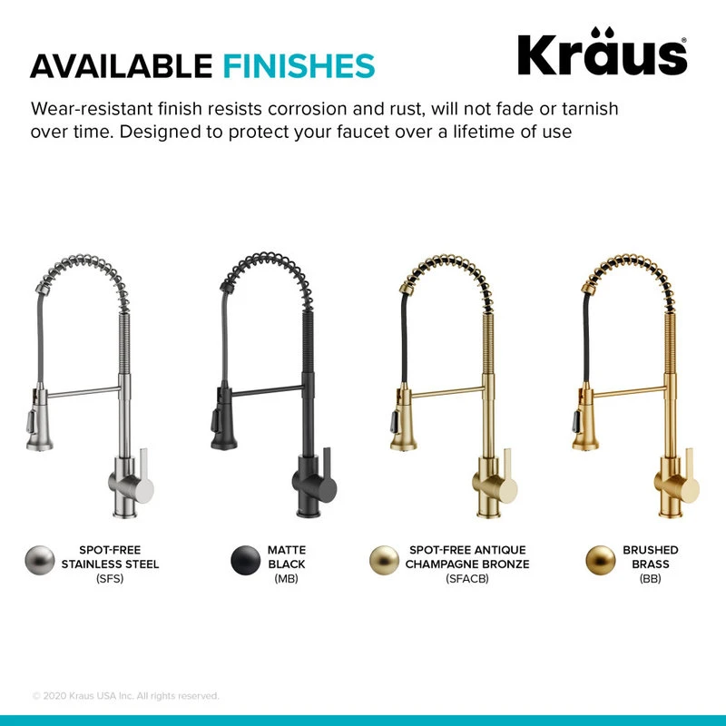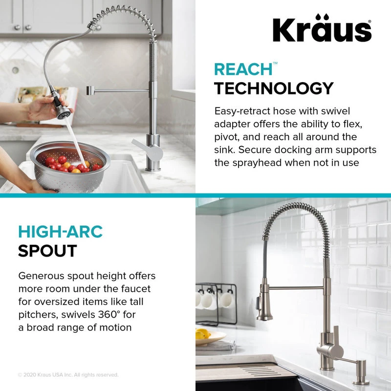 - COMMERCIAL PULL-DOWN DESIGN creates a distinctive professional look with an industrial open-coil spout, and provides the convenience of a pull-down sprayhead with an extended range of motion