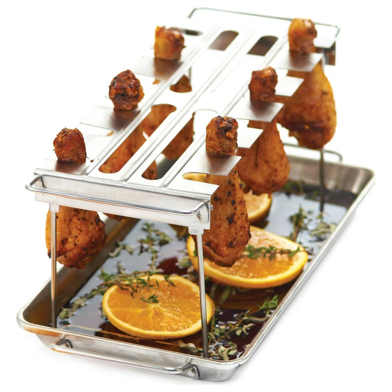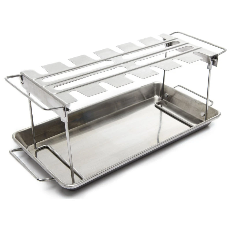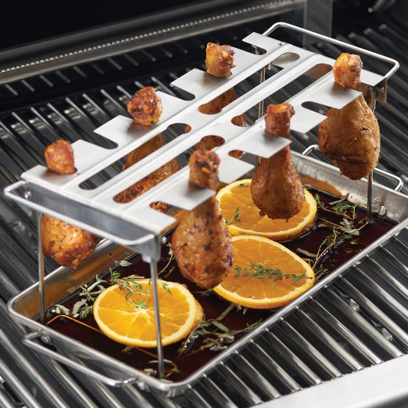 The Stainless Steel Wing Rack & Pan offers a premium accessory for use with your grill. This wing rack set includes a durable stainless steel pan and wing rack that folds for convenient storage. The stainless wing rack allows users to hang chicken wings, thighs, drumsticks, or other meats without placing them on the grill surface. This helps to cook the wings evenly without sticking to the grids, while the pan prevents flare ups.