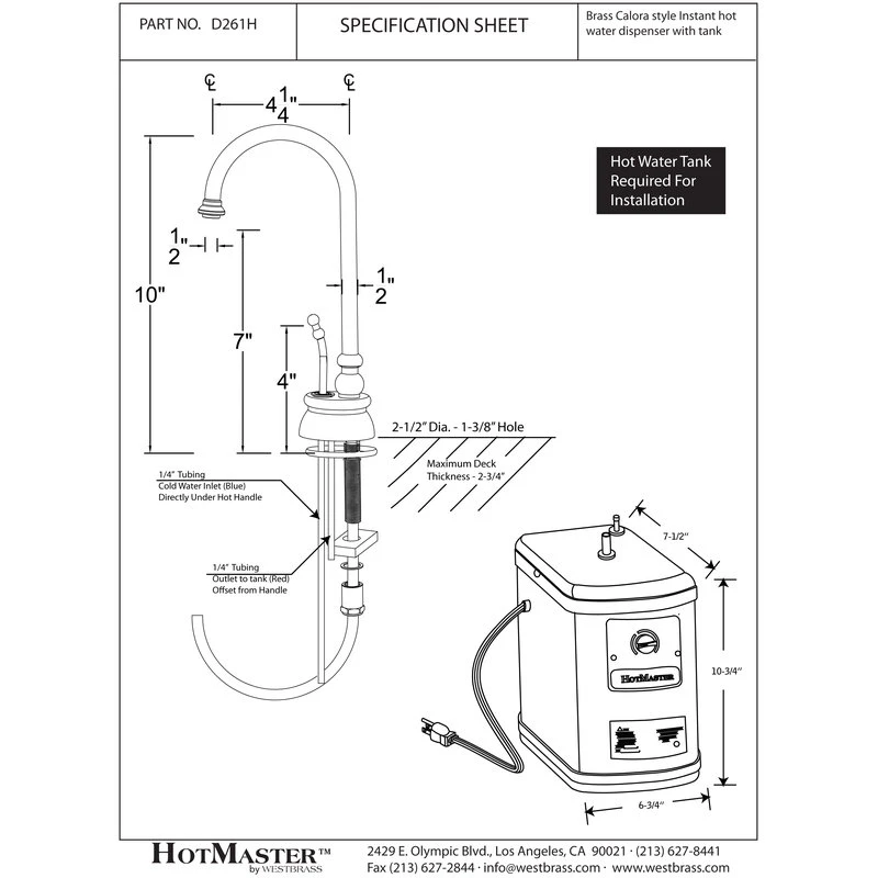 The Westbrass Calorah Single-Handle Hot Water Dispenser Faucet Kit with tank, offers quick and easy water control and its single handle automatically turns off hot water for your safety. The faucet features a high-arc spout for an attractive appearance. A QHT 1300W instant hot water tank, plugs into 120V and is included with this faucet. Mounting materials are included for convenient, single-hole installation.