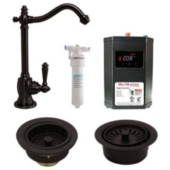 Solid brass faucet with Digital Tank (DT18N) includes carbon block filter, (F400) mounting bracket and Two Pack D214 Basket and D2089SEV Disposer, Large Post nut style kitchen sink basket and strainer