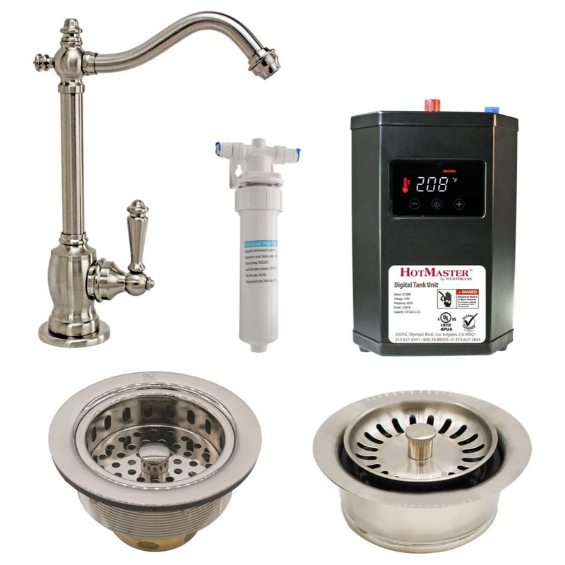 Solid brass faucet with Digital Tank (DT18N) includes carbon block filter, (F400) mounting bracket and Two Pack D214 Basket and D2089SEV Disposer, Large Post nut style kitchen sink basket and strainer