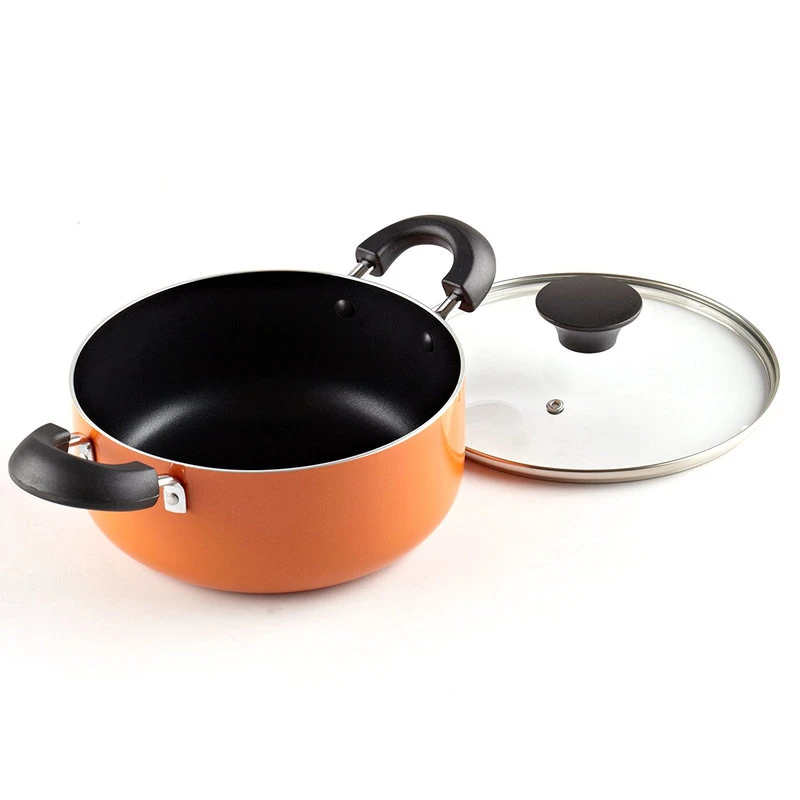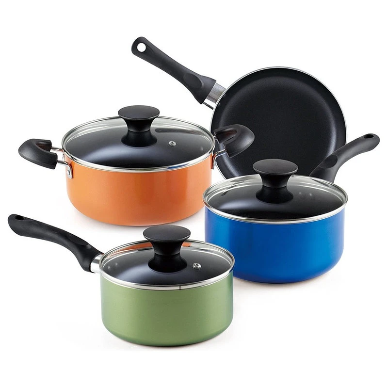 The Cook N Home 7-Piece nonstick cookware starter set, Multicolor includes: 1 qt saucepan with lid, 2 qt saucepan with lid, 3 qt casserole pot with lid, and an 8 in. Fry pan. Thick gauge aluminum provides even heat conduction and prevents hot spots. Nonstick coating for food release and lasts long. Tempered glass lids with steam vent for viewing food while cooking. Riveted soft touch handles stay cool when cooking and are comfortable works on: gas, electric, glass, halogen, ceramic, etc. Not induction compatible and not oven safe. Dishwasher safe and easy to clean.