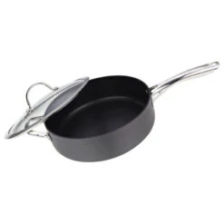 Cooks Standard Hard Anodize Premium Grade Nonstick 5-QT/11-inch Deep Straight Sauté Pan with Cover, cover is tempered Glass lid, protected by stainless steel rim outside of glass and Ergonomically designed Stainless steel handle, riveted for strength, premium grade nonstick deliver exceptional performance, Heavy gauge aluminum core is super heat distribution without any ” Hot spot”.