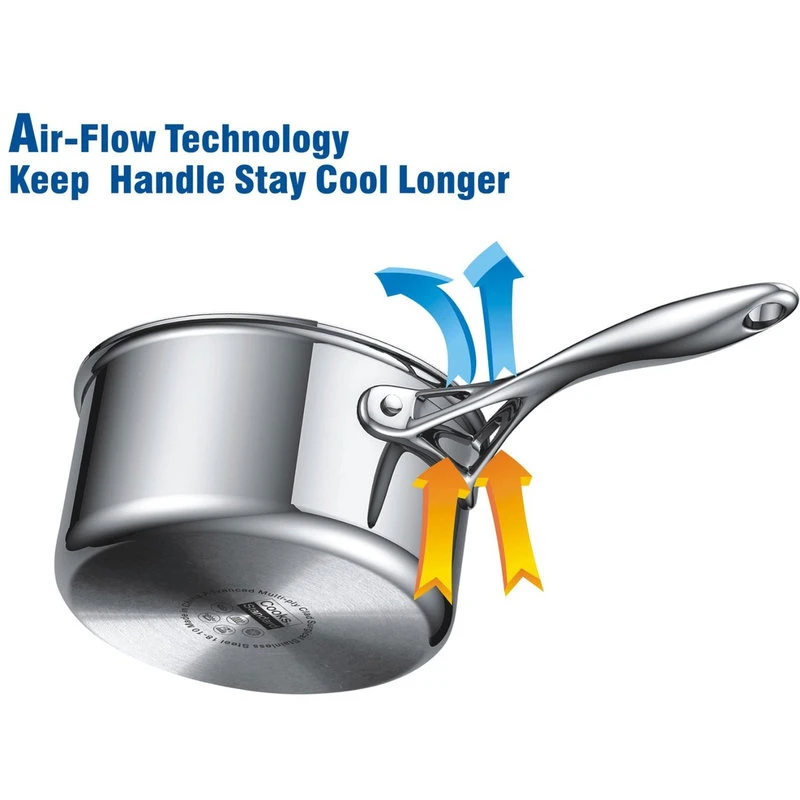 Cooks standard mulitclad stainless cookware features air-flow technology makes handle stay cooler than normal handle type. Constructed of clad metal of 3 layer: Interior lining is premium grade 18-10 stainless steel, core made of multi-element alloy aluminum for superior heat distribution, the core of aluminum goes from bottom all the way to side wall, stainless steel does not transmit heat quickly but aluminum does. Aluminum is soft and dents easily, stainless steel is hard and strong. This means you get the toughness of stainless steel with the even heat distribution of aluminum. Exterior is scratch resistant brushed treatment, bottom is also compatible to conduction stovetop, this cookware is dishwasher safe.