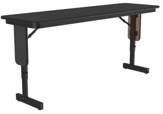 Panel Leg Adjustable Height Folding Seminar Table. Folding mechanism attached to back leaving underneath table open for user’s leg room. Side Panels give table a finished, dressy look. Made in USA.