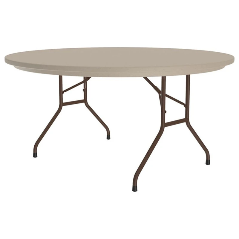Heavy duty, blow molded, one piece, plastic resin top folding table with strong steel ladder frame and steel legs. Made in USA.