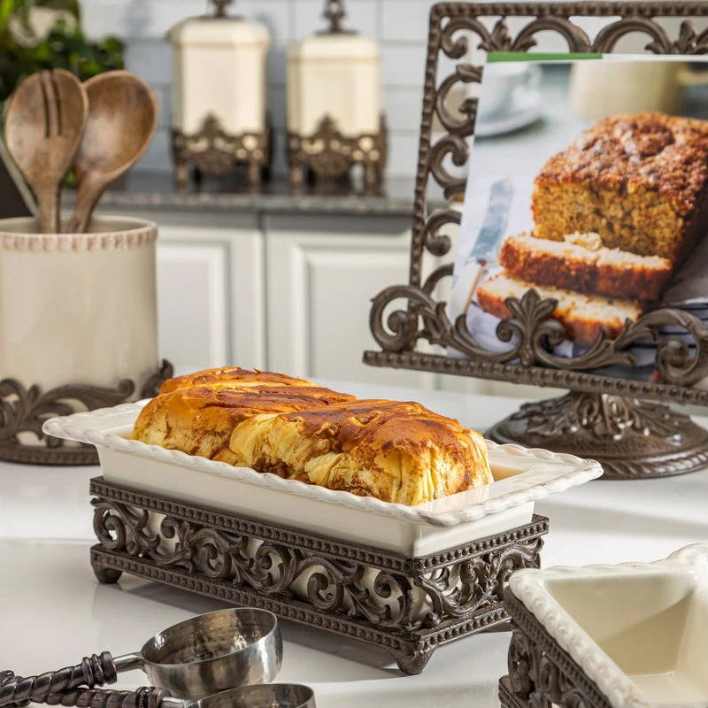 Be the first to review “Cream Stoneware Loaf Dish With Metal Acanthus Leaf Base.” Cancel reply
