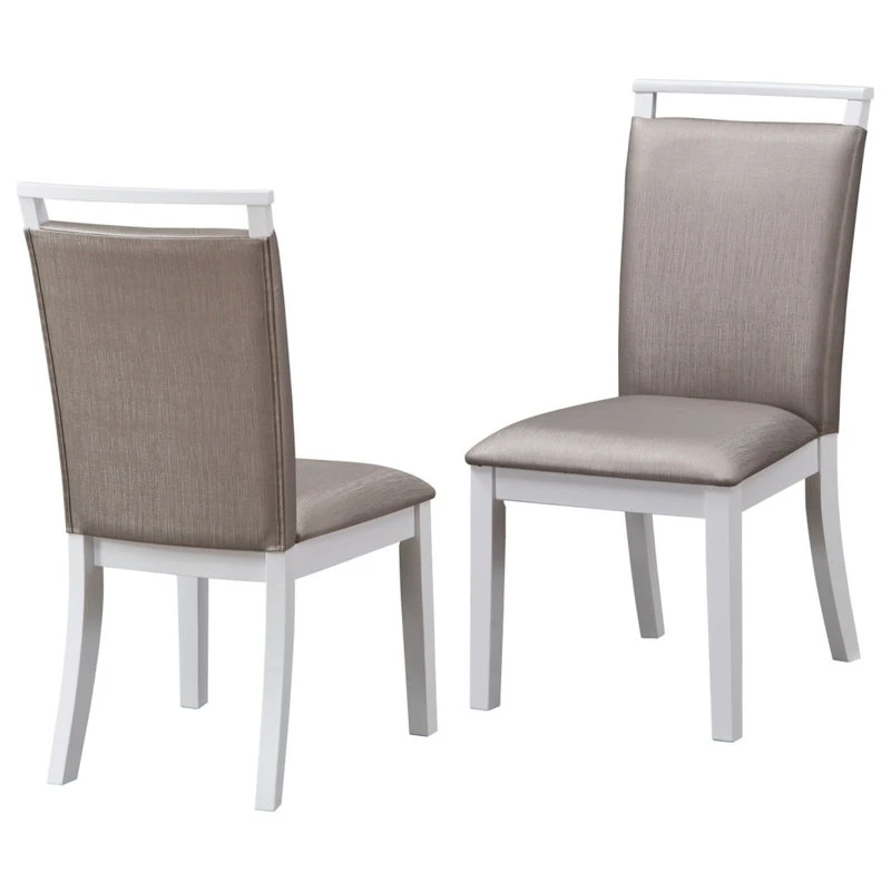 Danby 9 Piece Dining Set, Gray Fabric and White Wood (Table and 8 Upholstered Chairs). Both practical and attractive with its clean modern design, this Danby Dining Set is sure to enhance the look of any room while the contemporary flair complements existing decor. Crafted of solid wood and veneers in aCappuccino finish, this Danby Table strikes a sleek, rectangular silhouette with a slender edge while its base includes a straight apron and four square legs. The Danby Dining Chairs are made from solid wood frames and showcase a clean-lined design founded atop tapered legs, working well in a variety of aesthetics. Wrapped in foam-filled polyester fabric for an inviting feel, these Danby Dining Chairs have a unique hue that works well in a variety of color schemes.