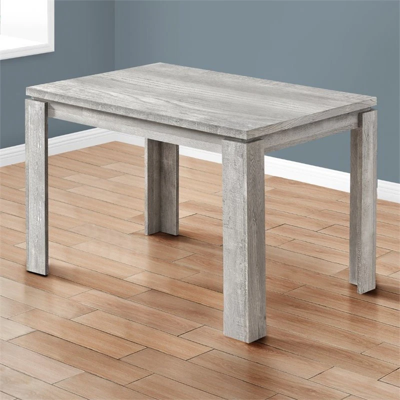 - Reclaimed wood look dining table in a trending gray wash finish with thick, block-style legs to keep everything in its place during your large gatherings