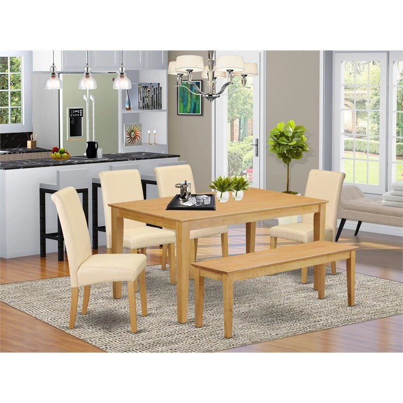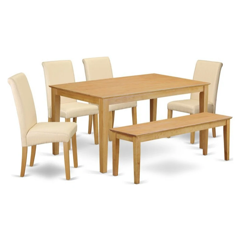 Add charm to your kitchen or dining space with our contemporary top quality Rubber wood Counter. This valuable CABA6-OAK-2 dining room table, barry upholstered parson chairs and bench provide distinct, fresh lines and stylish appeal. The Capri dinette table provides an eye catching, smooth Oak finish well-fitted to any sort of home decoration style. The fresh and clean lines dominate the cutting-edge design of the rectangular small kitchen table of this valuable kitchen table set. The dining chair is elegant & classic in design, comfortable & spacious to seat and serves the best of its purpose. 6% Cotton, 4% Polyester Linen fabric cushion material is durable, easy to clean and neutral in color to match any decor. The roll back design parson chair frame is made of oak color sturdy hardwood materials which provides sound stability and functionality. Oak finish bench matches well with both the table and the parson chairs. The modern style dining set is very easy to preserve and can readily blend with many decorations.
