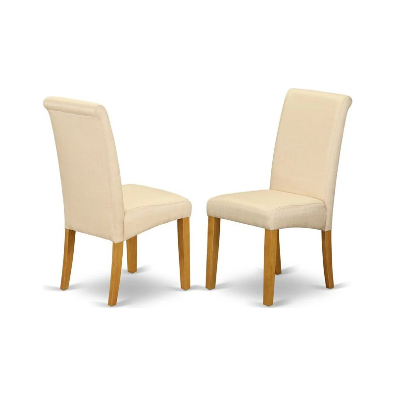 - The kitchen dinette set has an oak hardwood modern dining table and an amazing beige linen fabric upholstered dining chairs seat and high roll back that deliver beauty to your dining room and improve the charm of your great dining room.
