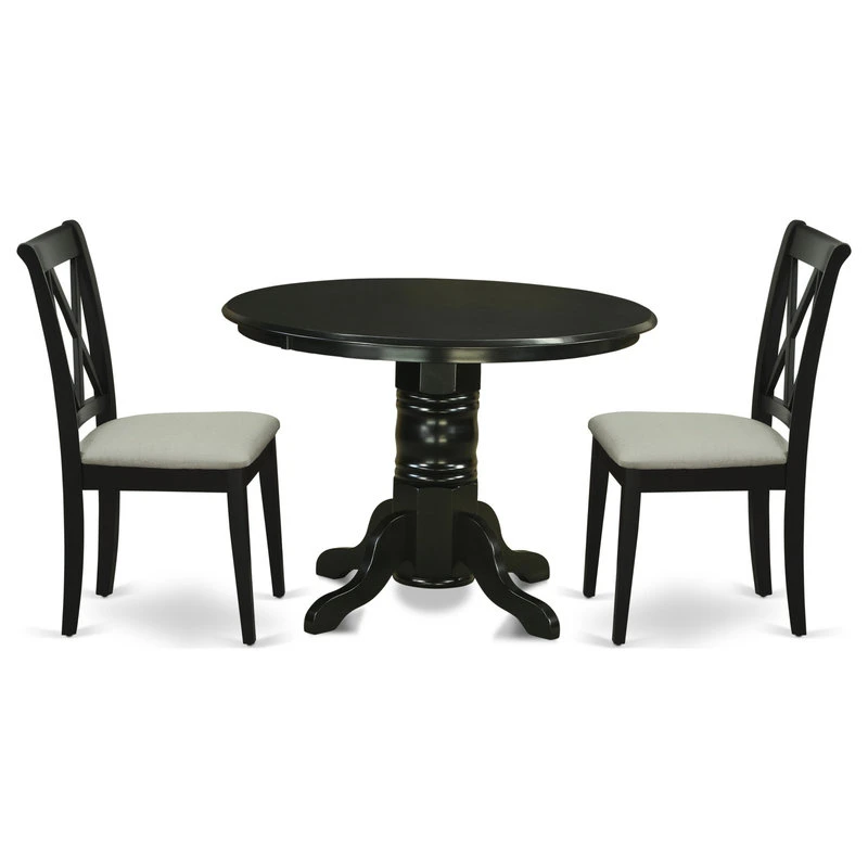 Turn your house into a home with this exclusive and sophisticated SHCL3-BLK-C kitchen dining set. The classic round dinette table offers a stunning black color to enhance any kind of living area or home’s kitchen area for any occasions. A thick curled ornate pedestal base provides strength and state-of-the-art impression to the round dining room table. Made up of rubber wood, the table is stable and offers a sturdy finish. This small dining table requires a very little space and it d be a great choice if you are struggling with space in your dining area. The kitchen table makes a really great addition for all kitchen space and corresponds all sorts of dining-room concepts. Slender Double X back kitchen chairs present fashionable and cozy seating, with Linen seats finished in elegant black which let you enjoy a nice and trendy dining experience. The frame of the chairs are engineered to offer a great amount of comfort to your spine and thus reduce the chances of back pain. The standard shape, size and design makes the dining area significantly attractive. This contemporary, budget friendly, durable and comfortable dining set can be good choice if you are looking for a great dining time experience with your family or friends.