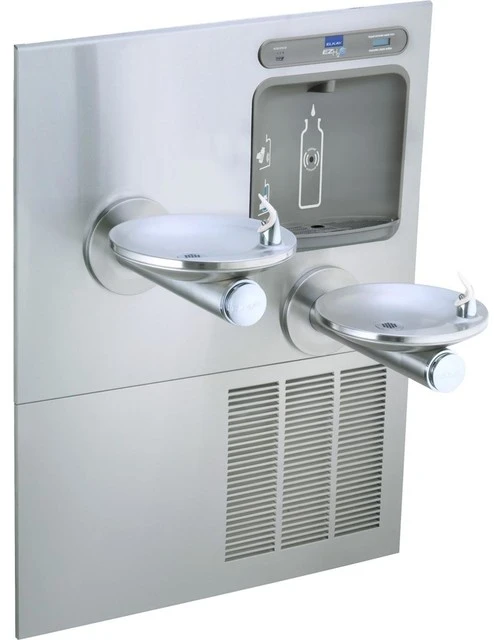 The Elkay EZH2O Bottle Filling Station delivers a clean quick water bottle fill and enhances sustainability by minimizing our dependency on disposable plastic bottles. Complete water station including bi-level refrigerated fountain with integral bottle filler. Sanitary no-touch sensor activation with automatic 20-second shut-off timer.