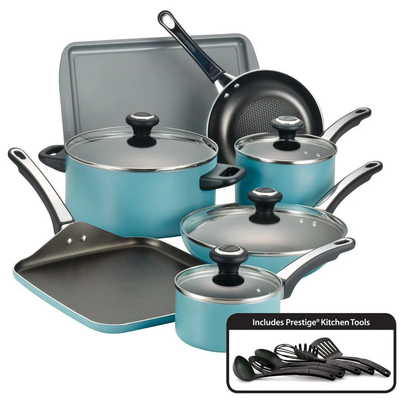 The Farberware High Performance Nonstick 17-Piece Cookware Set makes it easy to turn out complete, delicious meals. Farberware has brought performance, convenience and reliability to countless kitchens for over a century, and this cookware set continues that tradition for a new generation. Crafted from heavy-duty aluminum that heats evenly, the covered saucepans and Dutch oven feature long-lasting nonstick for effortless food release and easy cleanup. Both skillets and the griddle boast the unique dimpled surface of the SmartGlide? Nonstick System with top-quality nonstick which improves the nonstick’s durability and creates air pockets that transfer heat to food quickly. Choose from six convenient Prestige(r) nylon kitchen tools to flip pancakes on the griddle, stir marinara in a saucepan or serve a delicious stew from the Dutch oven. Double-riveted handles on the cookware offer a confident grip, and shatter-resistant glass lids seal in heat and moisture. The cookware is oven safe to 350?F, the cookie pan safe to 450?F, and the entire set dishwasher safe for convenience.