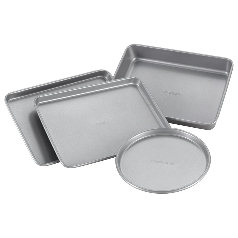 Farberware Bakeware meets the demands of all the busiest kitchens, and this Farberware Nonstick Bakeware 4-Piece Toaster Oven Bakeware Set is designed for creating favorite baked goods in smaller ovens. Farberware has provided more than a century of reliability, value, and performance to generations of home bakers, and upholds that tradition with every piece of sturdy and dependable bakeware. Just the right sizes for the Farberware Toaster Oven, the pans in this set make it easy to enjoy homemade pizzas, cookies and even smaller casseroles. The bakeware set includes two 10-inch x 7-inch cookie pans perfect for baking chocolate chip cookie or biscotti, a 10-inch x 7-inch cake pan for creating strawberry cake or brownies, and a 7-inch pizza pan for making a savory BBQ chicken pizza. Featuring heavy-duty construction, the durable toaster oven pans reliably resist warping and heat evenly to help reduce hot spots that can burn baked goods. Nonstick inside and out delivers great food release with quick cleanup. Each pan is oven safe to 450?F, and even better, this entire toaster oven set makes an ideal addition to the standard-size bakeware and other pans in the Farberware Bakeware collection.