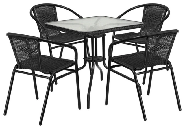 If you love hosting family and friends on your deck or need extra seating for the new dining patio of your cafe, this square table and 4 chair set is just what you need. The table’s rippled designer glass top has a smooth surface for keeping items level. The rattan edge band complements the chairs and adds just the right touch for a stylish cohesive look. The lightweight chairs feature a curved back, comfortable rattan seat and integrated arms. Cross braces provide extra stability when sitting and these sturdy chairs hold up to 352 lb. weight capacity. For easy storing and cleaning purposes these chairs stack up to 23 high. This set was designed for all-weather use making it a great option for indoor and outdoor settings. For longevity, care should be taken to protect from long periods of wet weather. Whether you are just starting your business, expanding your “al fresco” seating or springing for the outdoor kitchen you’ve always wanted, this set will give you the perfect look.